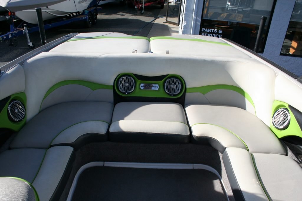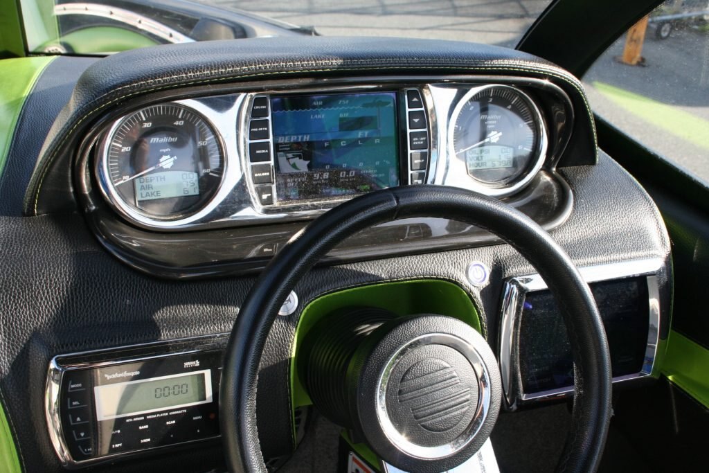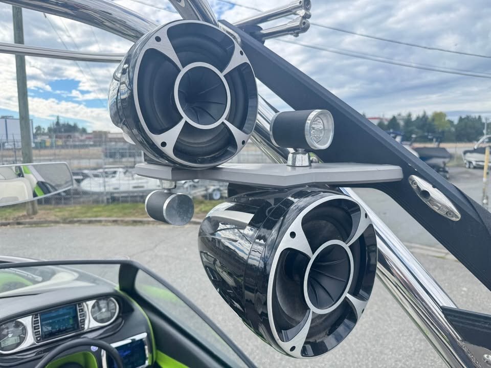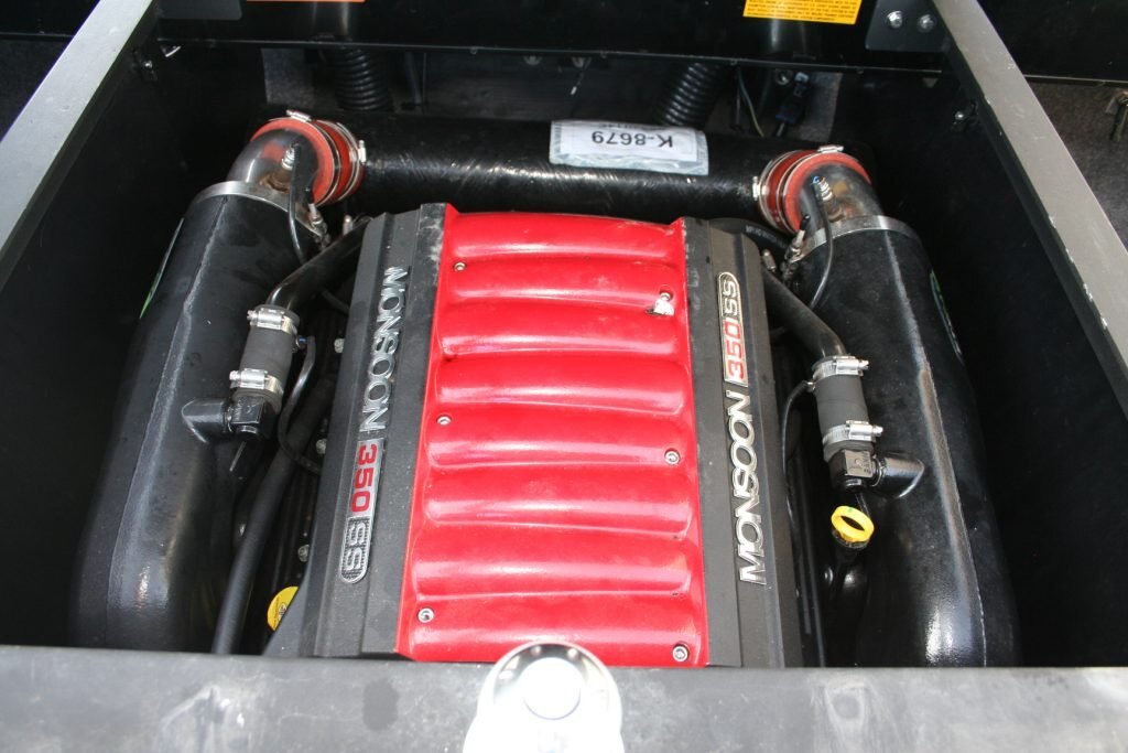- Featuring the Indmar monsoon 350, Dual Battery set up, 3 vent heater, Mali View display with rider pre-sets, Flip up bolster drivers seat, snap out carpet, pull up cleats, Swivel wake/surf racks, Underwater led swim lights,  Rockford BT stereo with 12″ sub, Wet Sounds tower speakers, Tower lights, Tower mirror, Bimini top, boat cover, rear swim ladder, Tandem axle Boatmate trailer with swing tongue.