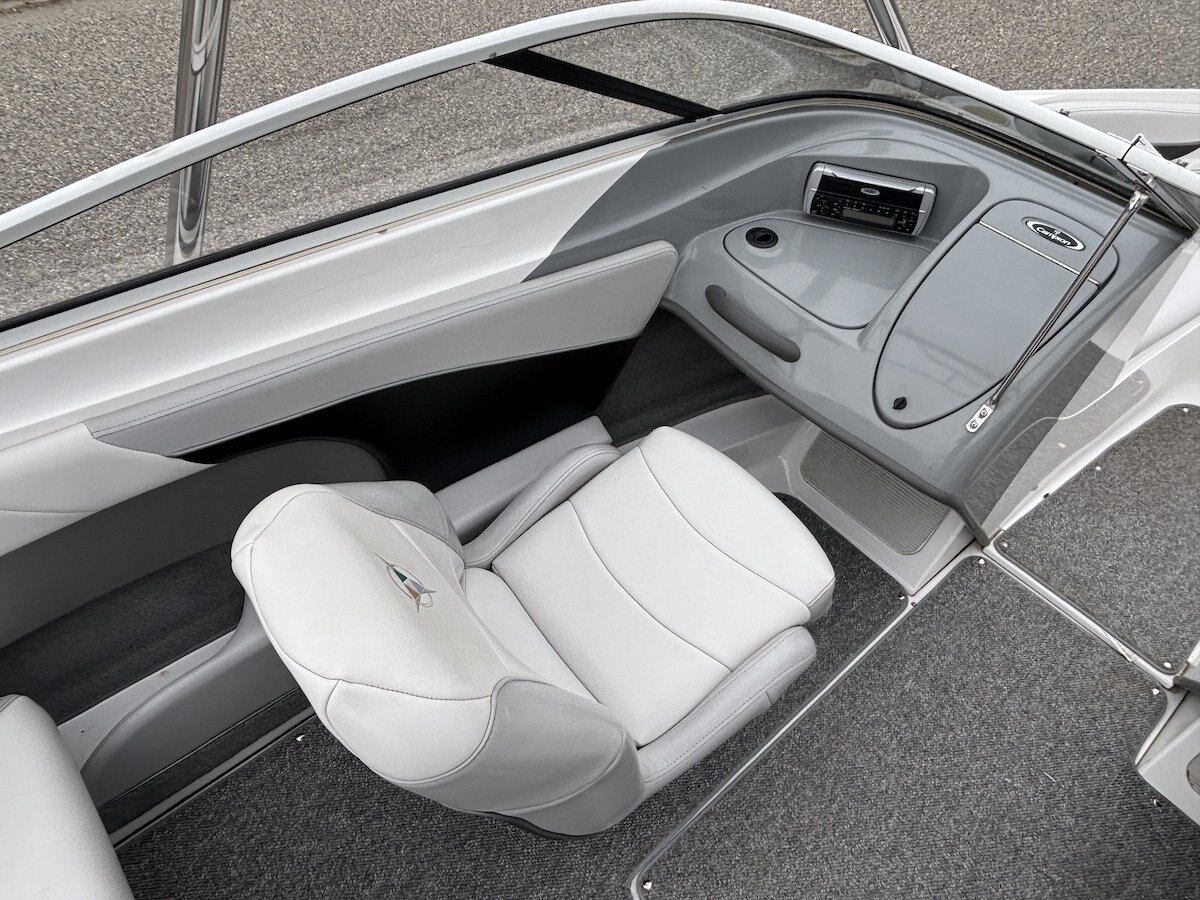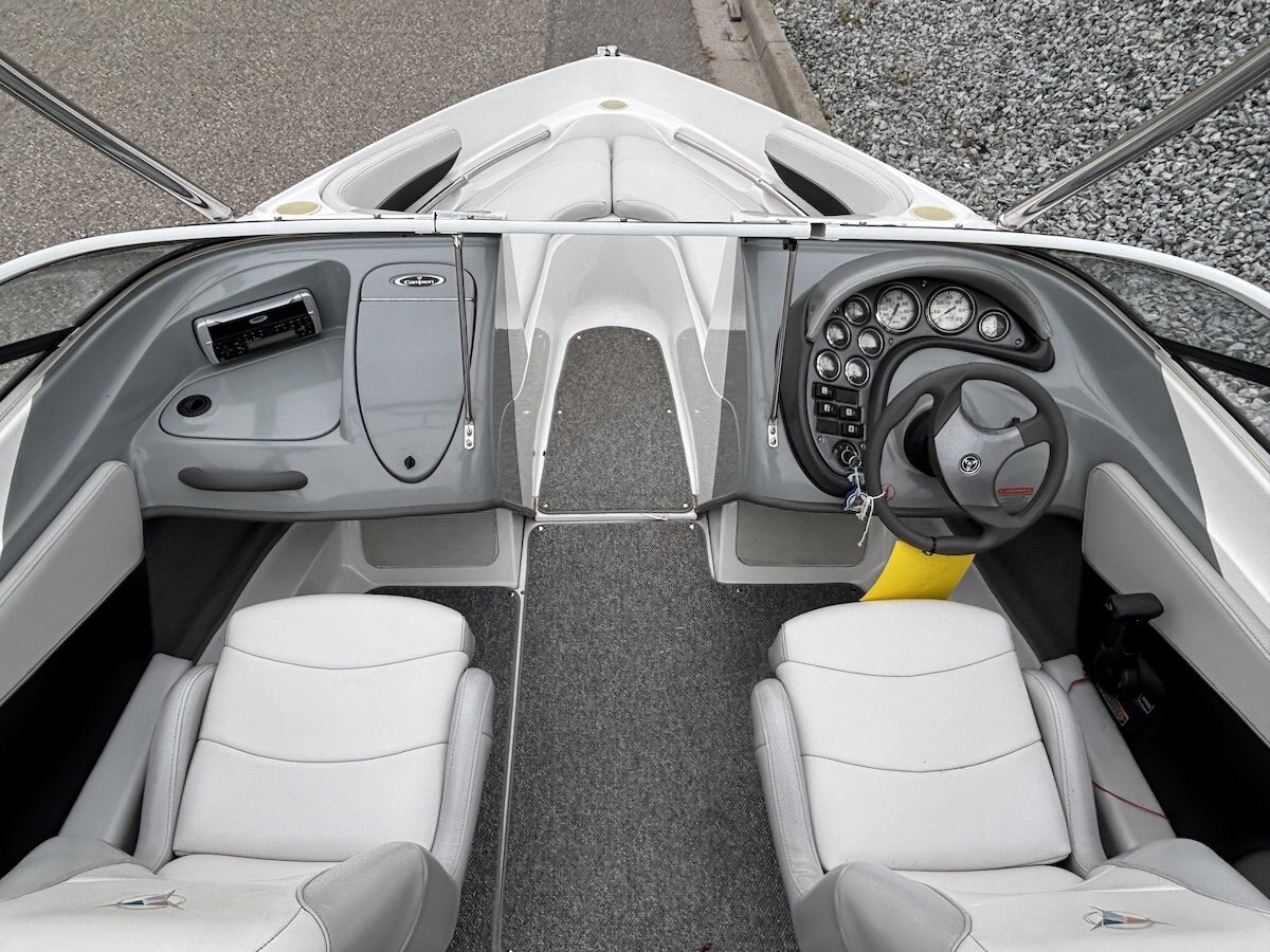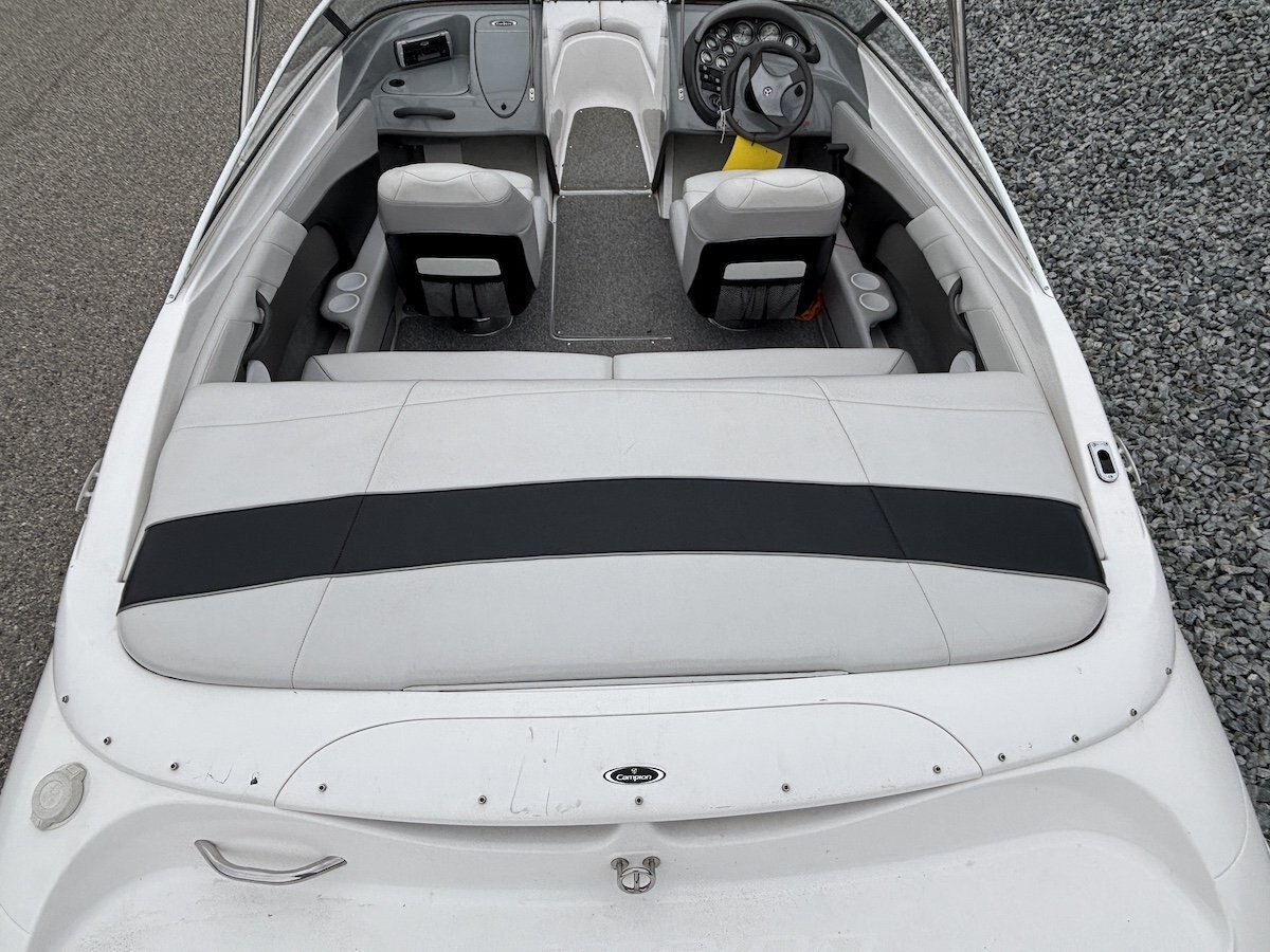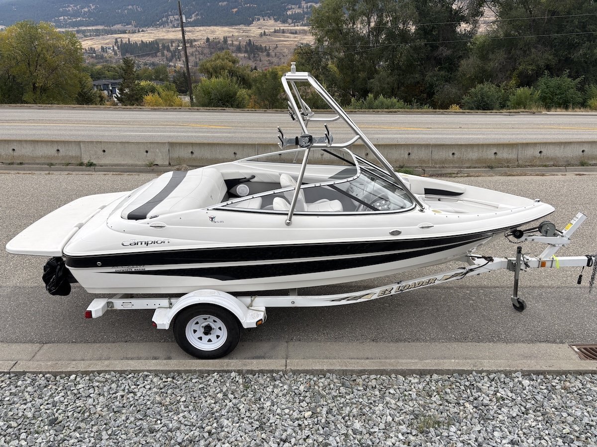 Not Your Average 20ft Bowrider…. This is a great Campion S545 Allante Bowrider that’s large enough to handle big chop and open water, but small enough to be easily towed and launched whenever the notion takes you. This boat is clearly a cut above the usual North American bowrider brigade, including the likes of Bayliner, Maxum, Larson and others. Watch the video tour to find out why… When you look closely at the details it’s easy to tell that the design and engineering that goes into building this Campion is well beyond what you’d expect for a boat of this size and type. From the plush upholstery and racy helm layout to the high performance hull shape, this boat is accomplished in every regard… However given it’s easy to manage size, both around the dock and on the road (being carried nicely on a twin axle roller coaster trailer) and modest towing weight, this boat is every bit as easy to own as any 20ft bowrider. So really, you get the best of both worlds… A boat that’s easy to tow, launch, recover and store; as well as one with fantastic performance and striking looks that’s a cut above the rest. Whether you’re upgrading from a jet ski or smaller boat, or even looking to get started boating in style, this Campion 545 Allante is definitely worth a close look. This one is in lovely condition.