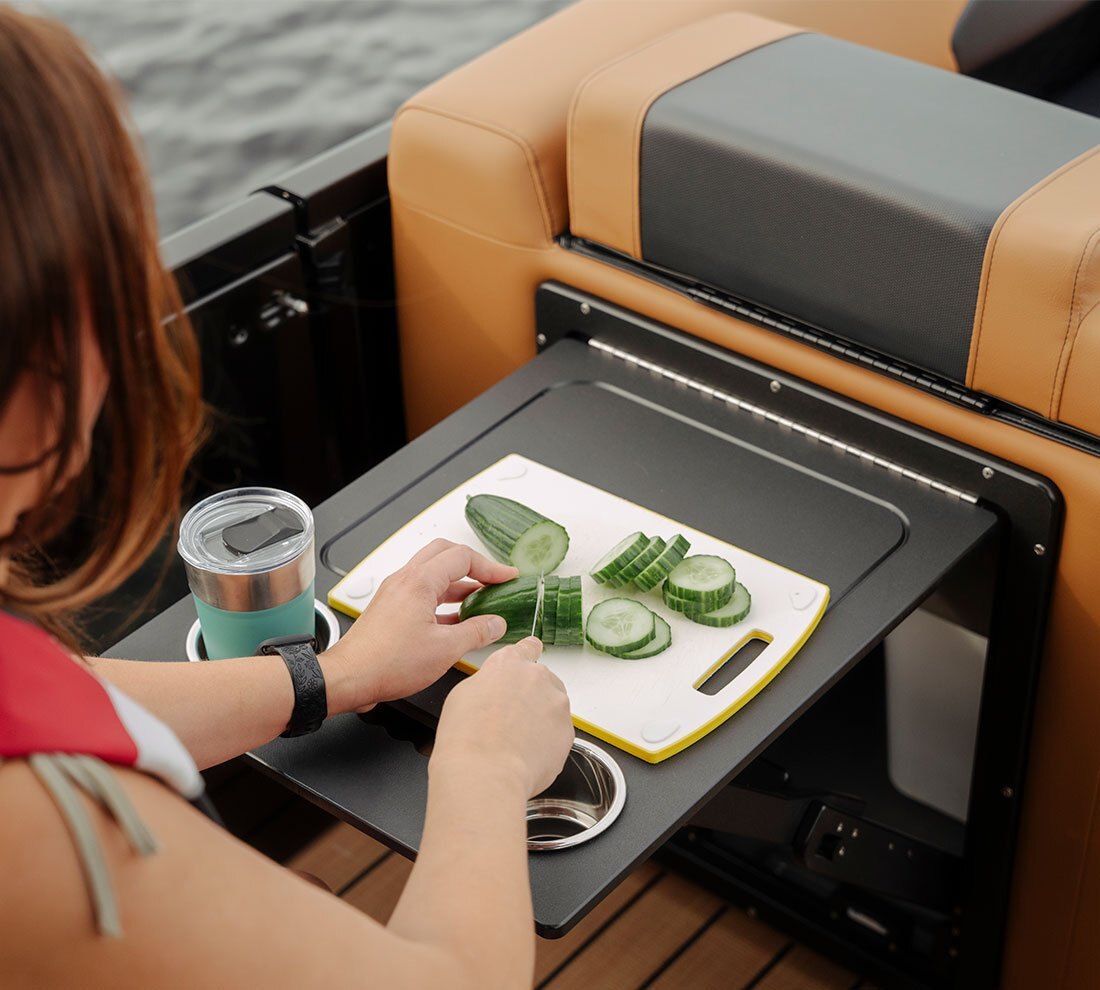 • Sport Edition including premium upholstery textured vinyl and LED lighting on floor, bimini top, pontoon logs, speakers, and fixed cup holders