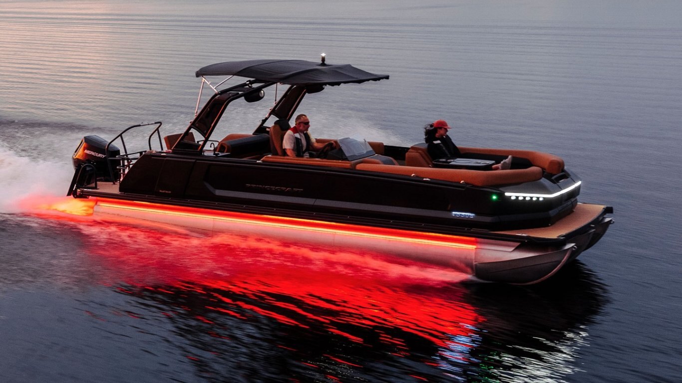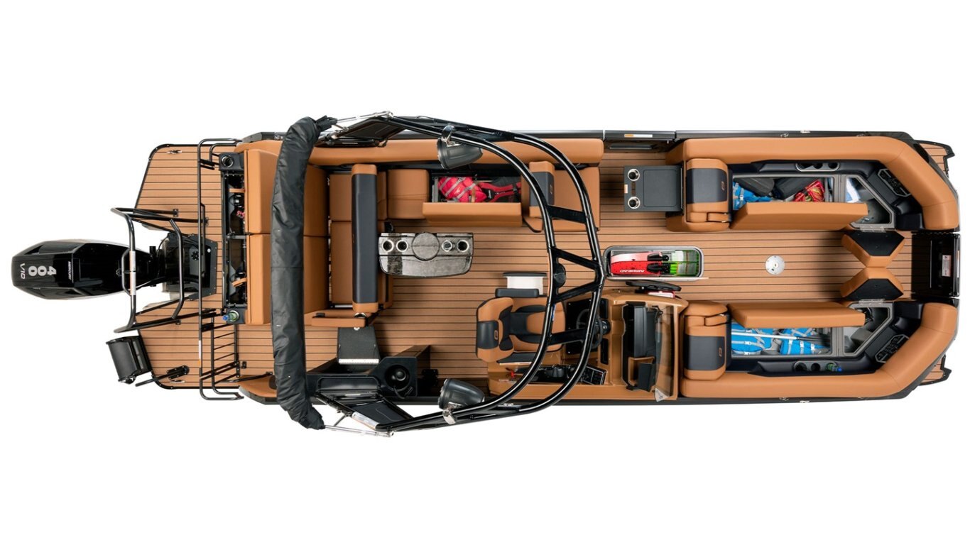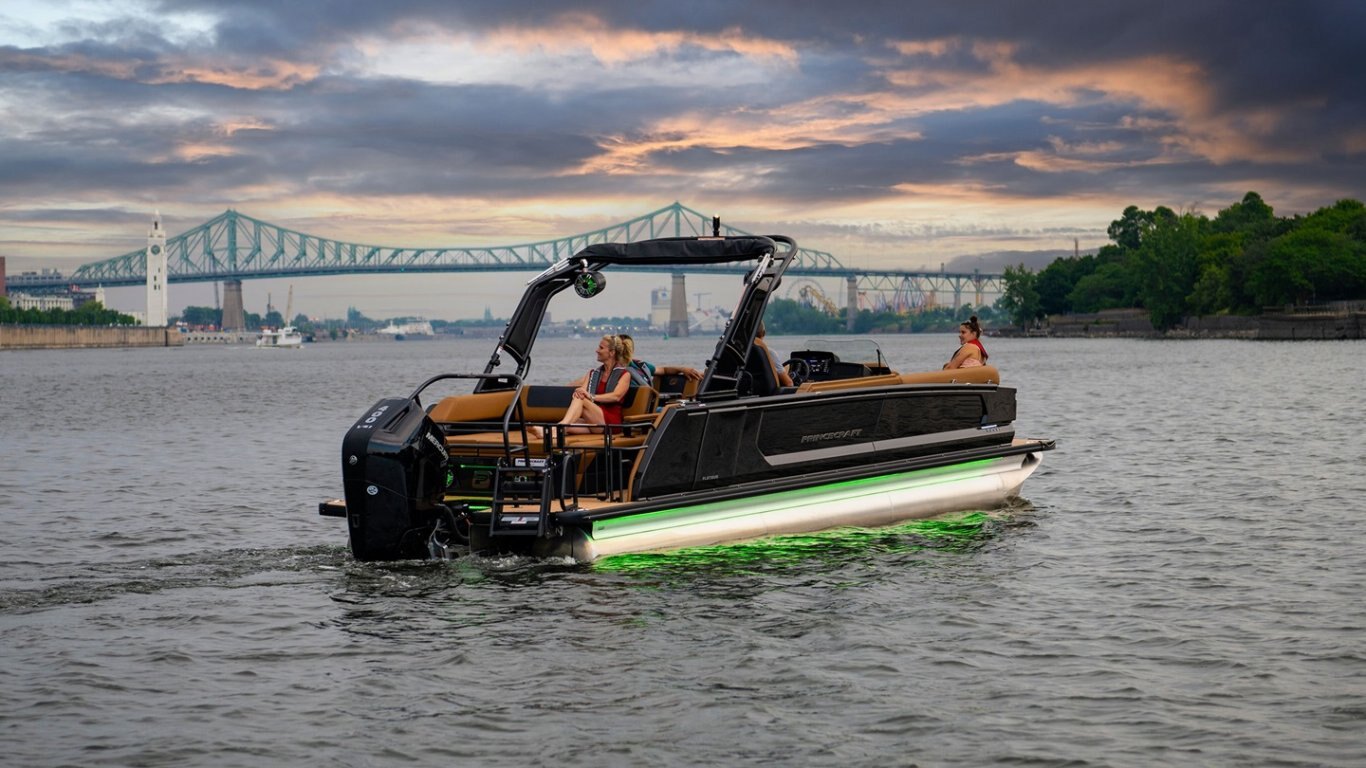 • Sport Edition including premium upholstery textured vinyl and LED lighting on floor, bimini top, pontoon logs, speakers, and fixed cup holders