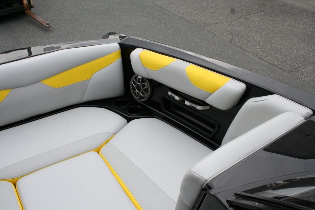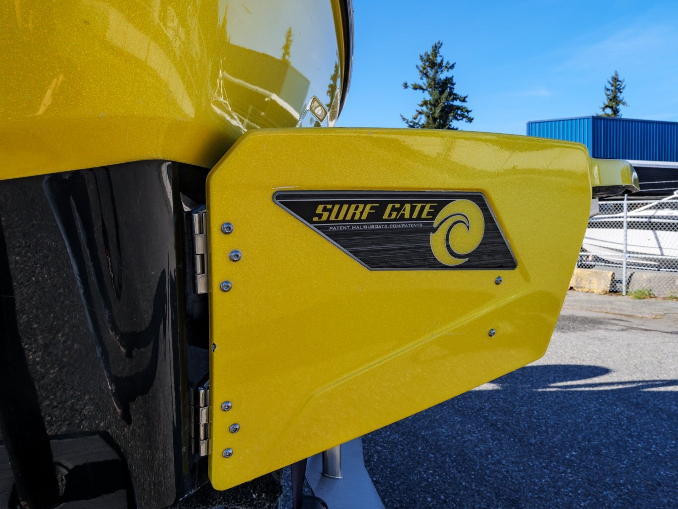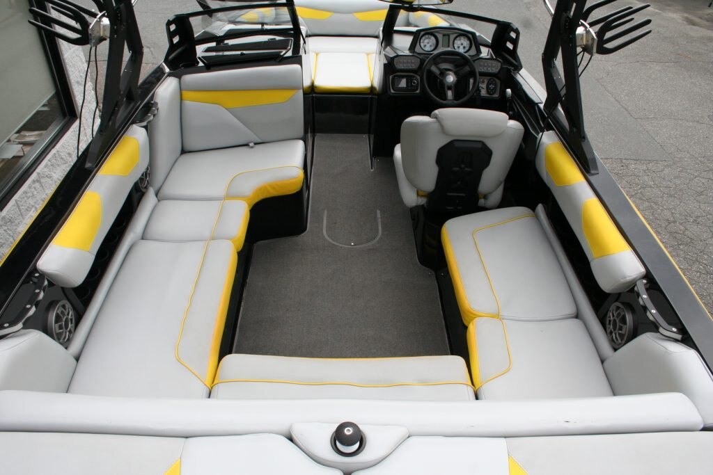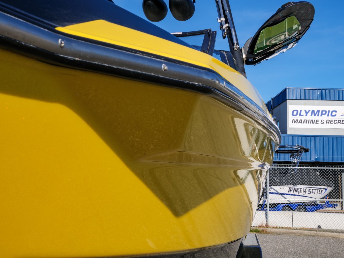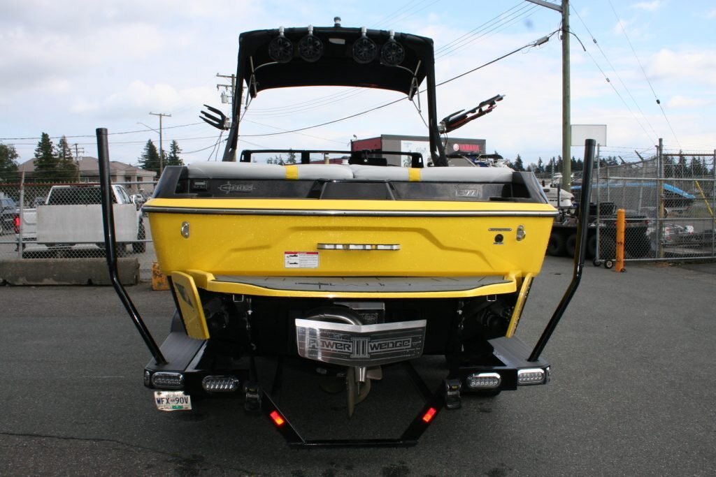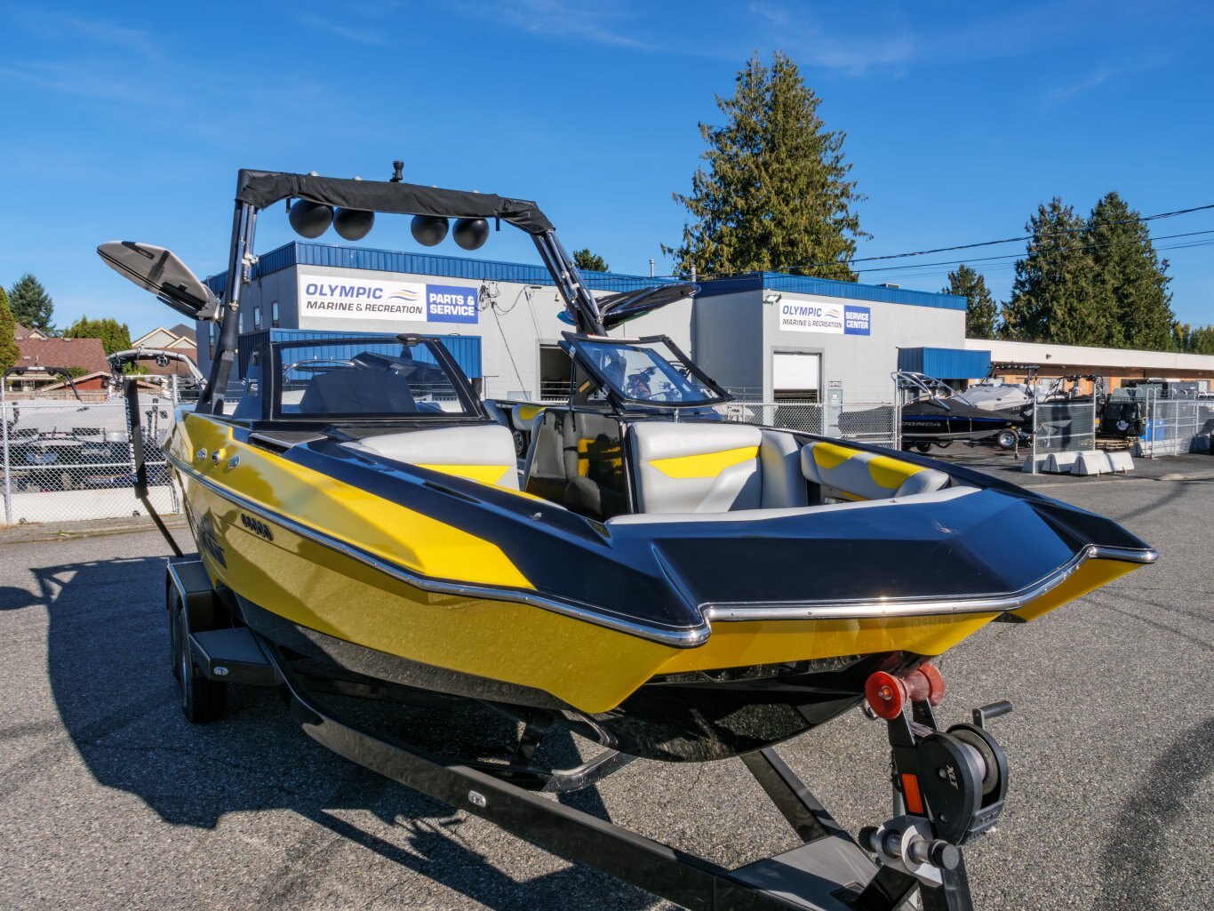 A High resolution Heavy Metallic Yellow (This Boat absolutely glows on the water)  Featuring the PCM Monsoon 409 engine, Dual battery set up, Pull up cleats, Power Wedge 3, Surfgate with surfband, Wet Sounds audio system, 10″ subwoofer, Wet Sounds tower speakers, Fire suppression system, Flip up bolster drivers seat, Snap out carpet, Bimini top, Boat cover, Heater, Tandem axle. Malibu trailer with swing tongue.