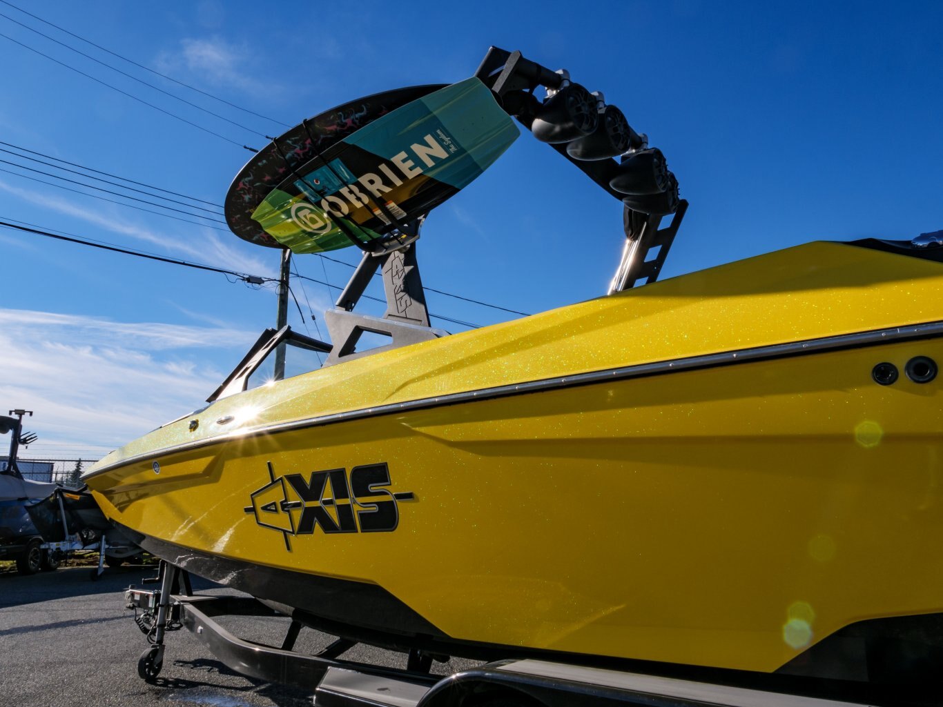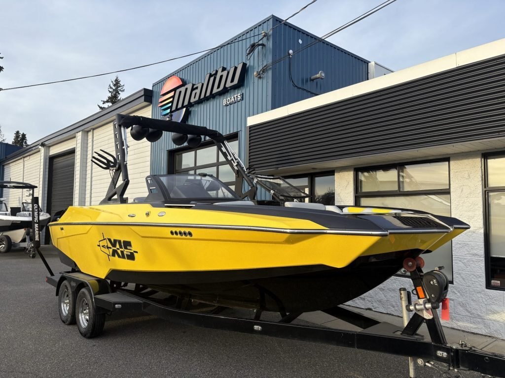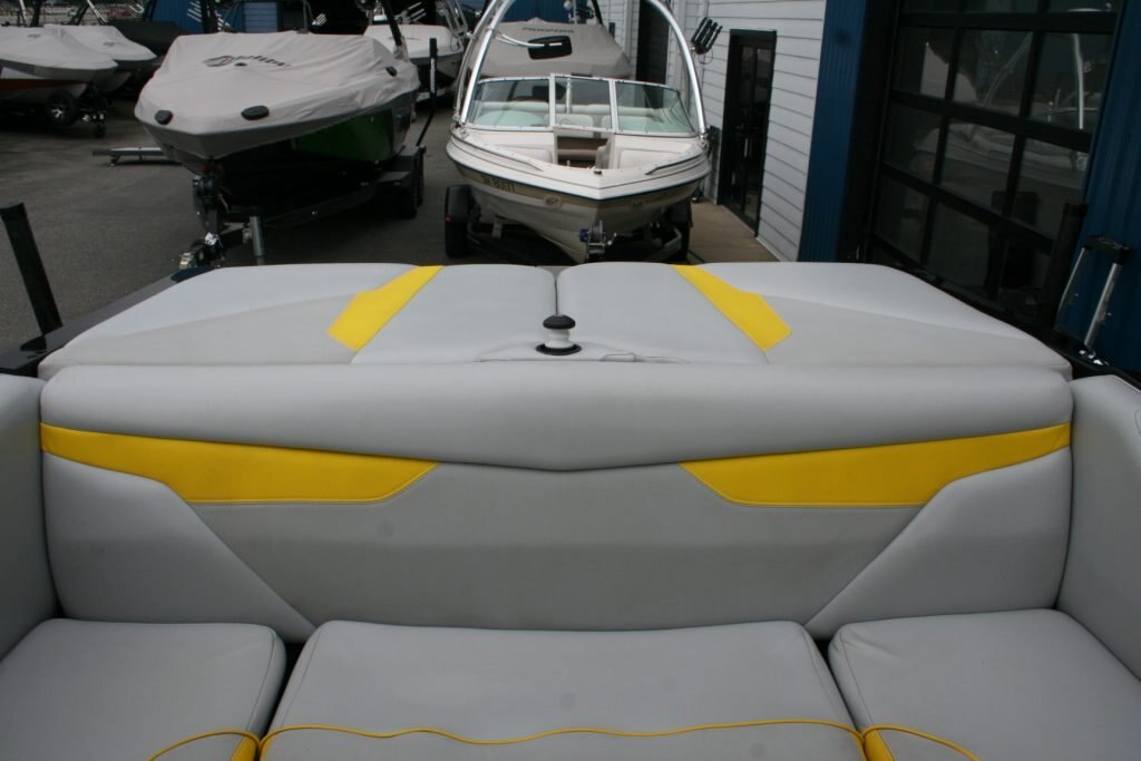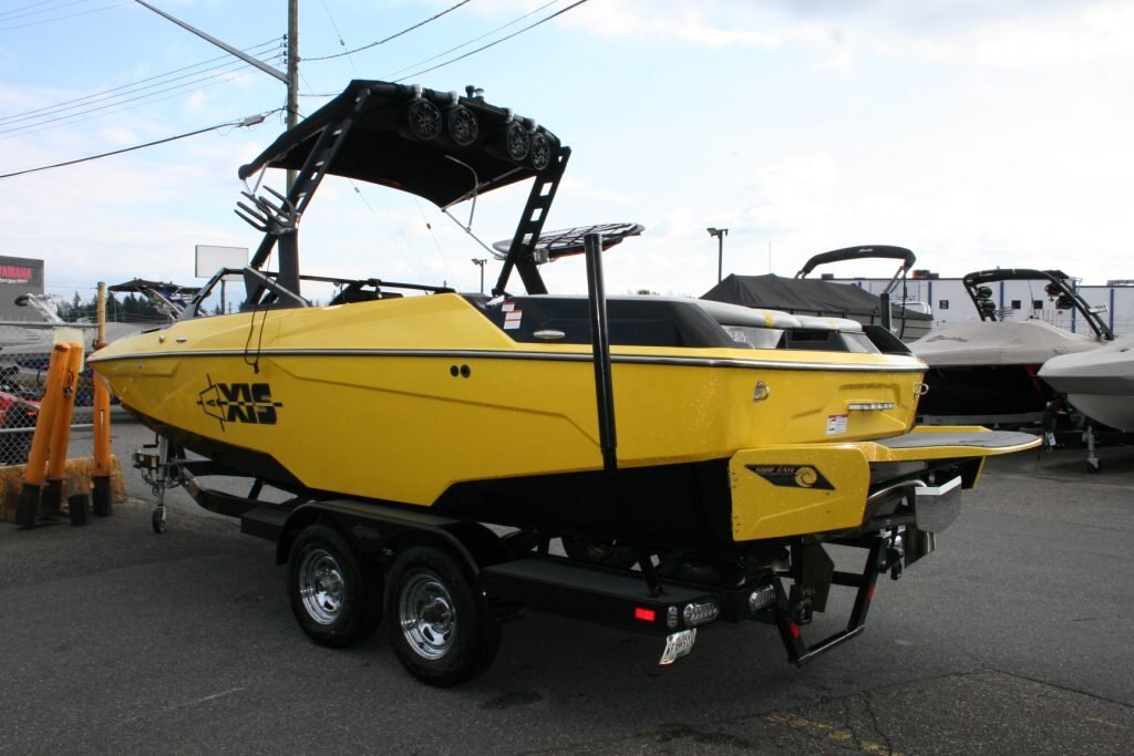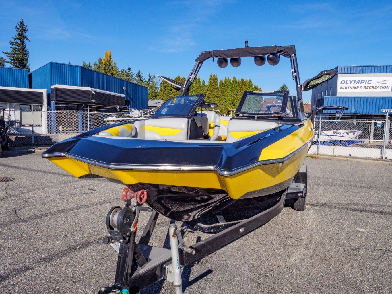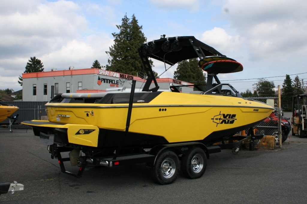 A High resolution Heavy Metallic Yellow (This Boat absolutely glows on the water)  Featuring the PCM Monsoon 409 engine, Dual battery set up, Pull up cleats, Power Wedge 3, Surfgate with surfband, Wet Sounds audio system, 10″ subwoofer, Wet Sounds tower speakers, Fire suppression system, Flip up bolster drivers seat, Snap out carpet, Bimini top, Boat cover, Heater, Tandem axle. Malibu trailer with swing tongue.